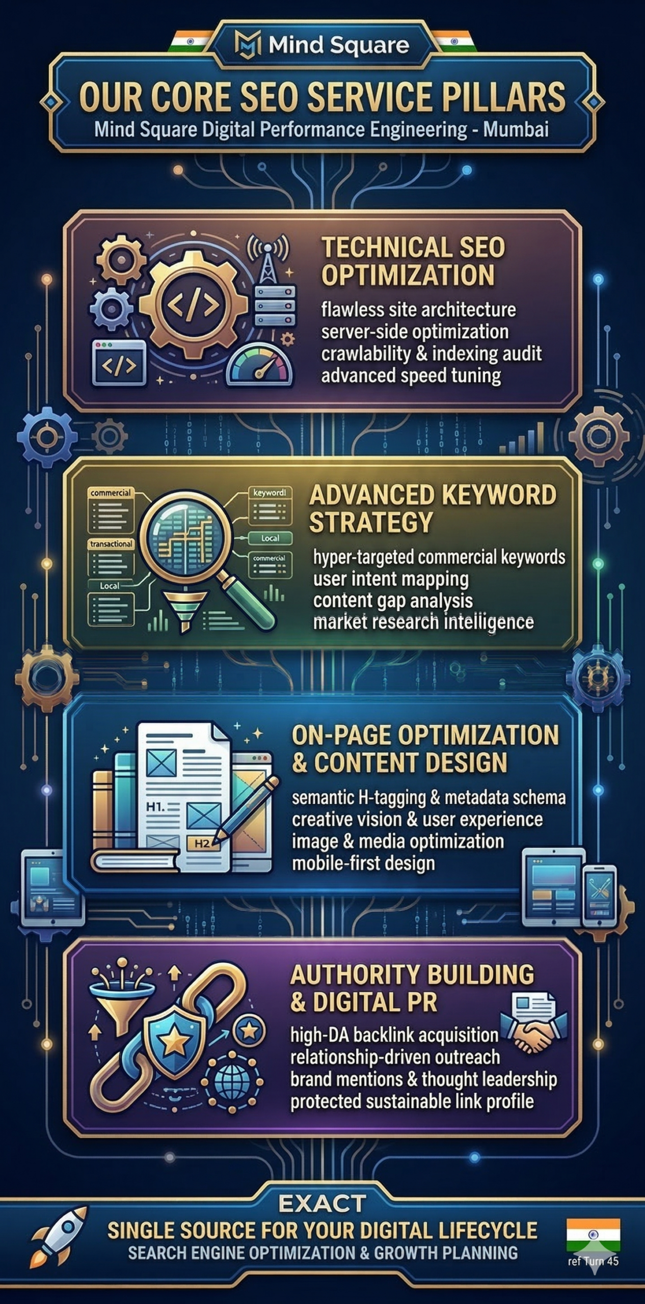 Being on Google isn’t enough; you need to be seen by the right people at the right moment. At Mind Square, we don’t just “do SEO.” We architect comprehensive Search Engine Optimization (SEO) services engineered to maximize your online visibility, drive qualified organic traffic, and deliver a measurable Return on Investment (ROI).